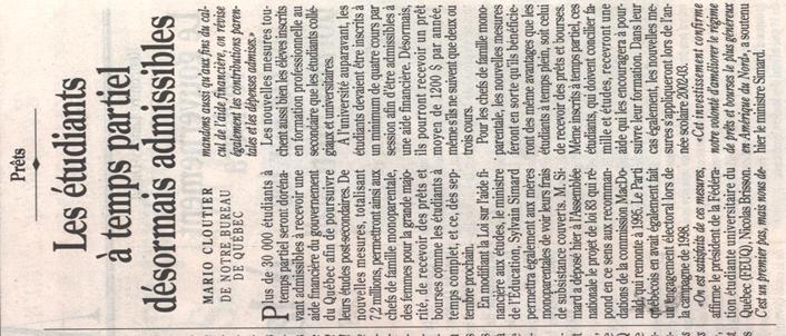 étudiants à temps partiel désormais admissibles - 1er mai 2002
